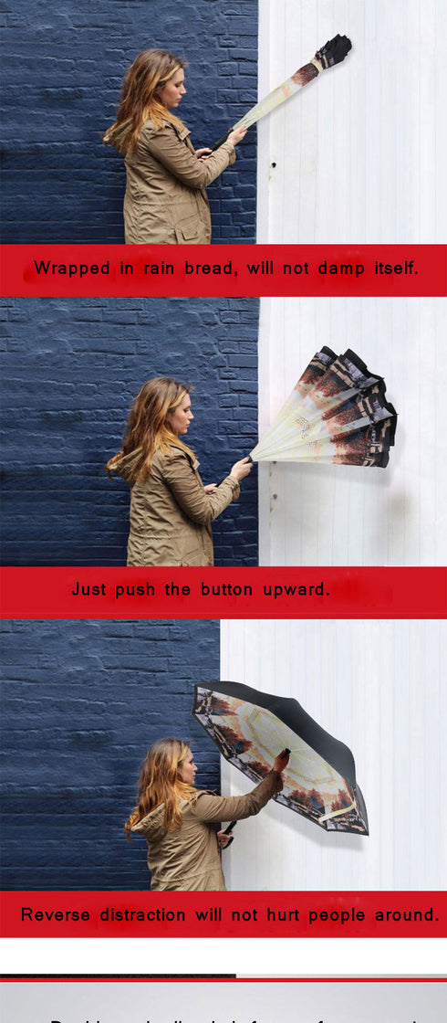 If you've ever been stuck outside during a rainstorm and your umbrella was blown inside out by the wind, we understand your frustration. What's worse is when you get caught in the rain wearing your favorite clothes or your phone gets wet. Reversebrella™ is the world's first reversible umbrella! It closes inside-out, which prevents it from getting blown out and destroyed! Another reason you need Reversebrella™ reversible technology is that it helps prevent puddles and watermarks from forming wherever you place it down.